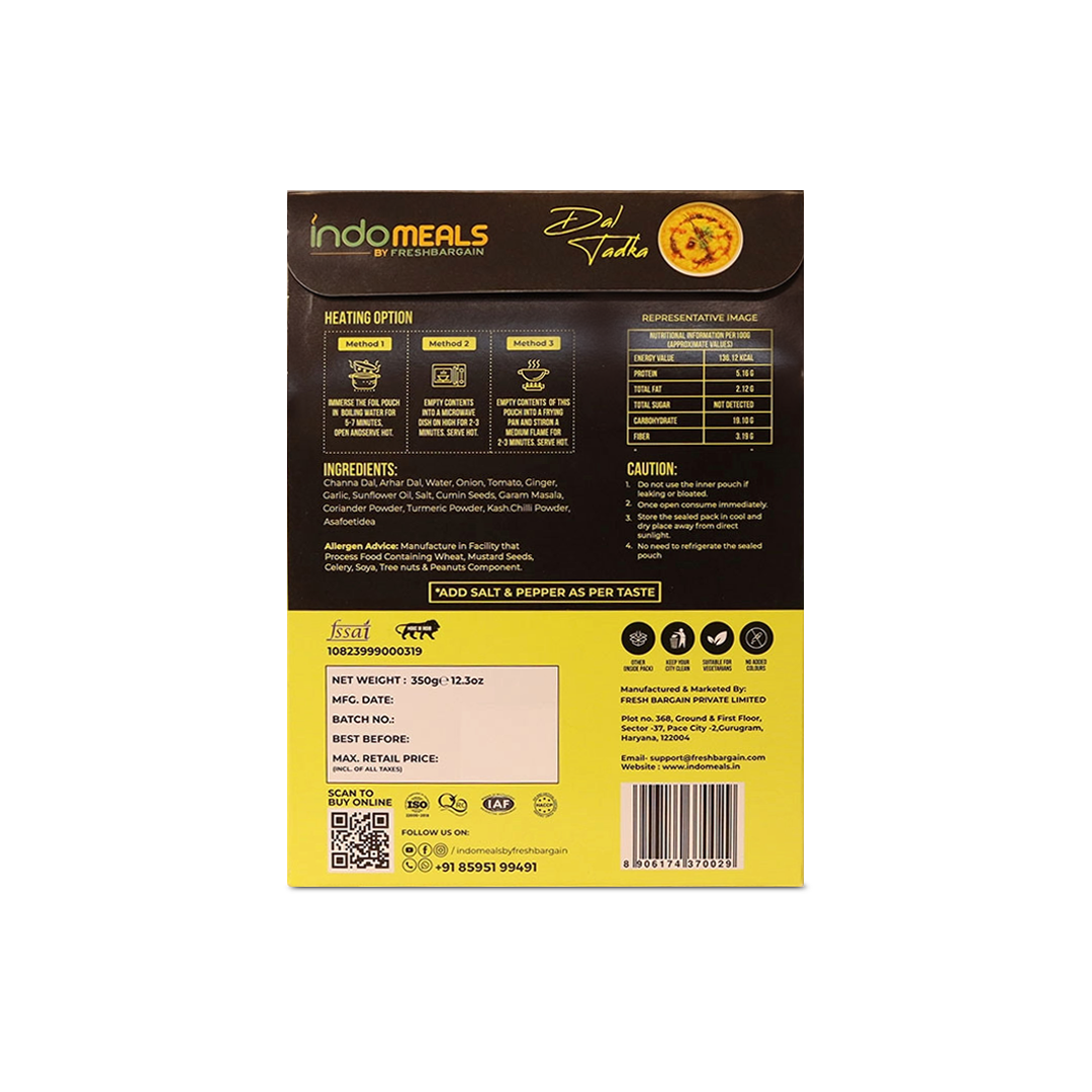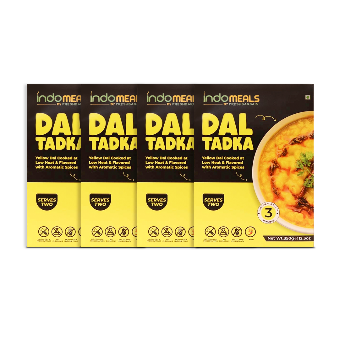 Chef cooked Ready to eat Dal Tadka, pack of 4 of 350gm each Instant solution for all your food cravings, Just Heat and Eat Shelf life: 18 Months; No Preservatives, Artificial Flavors or Colors Added; Safe and Hygienic Packaging We use authentic and hand ground spices to keep the homely essence intact in our instant meals A variety of mouth-watering dishes available