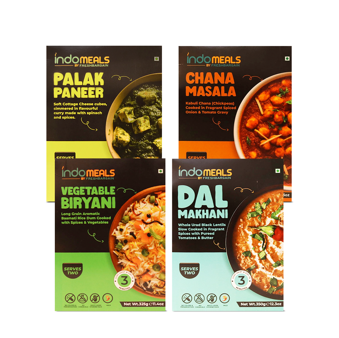 Chef cooked Ready to eat Palak Paneer, Dal Makhani, Vegetable Biryani, Chana Masala, pack of 1 of 350gm eachInstant solution for all your food cravings, Just Heat and EatShelf life: 18 Months; No Preservatives, Artificial Flavors, or Colors Added; Safe and Hygienic PackagingWe use authentic and hand-ground spices to keep the homely essence intact in our instant mealsA variety of mouth-watering dishes is available