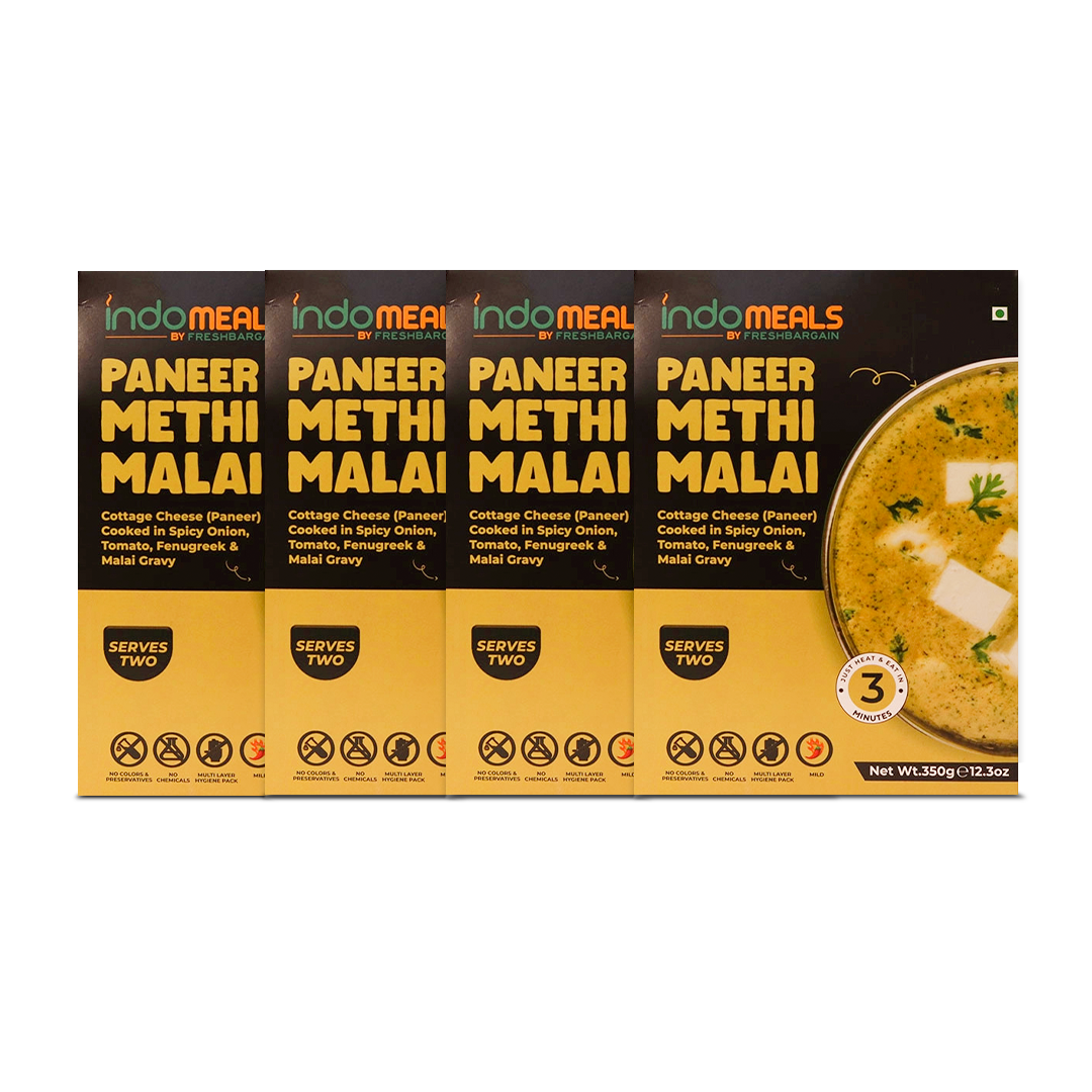 Chef cooked Ready to eat Paneer Methi Malai, pack of 4 of 350gm each Instant solution for all your food cravings, Just Heat and Eat Shelf life: 18 Months; No Preservatives, Artificial Flavors or Colors Added; Safe and Hygienic Packaging We use authentic and hand ground spices to keep the homely essence intact in our instant meals A variety of mouth-watering dishes available