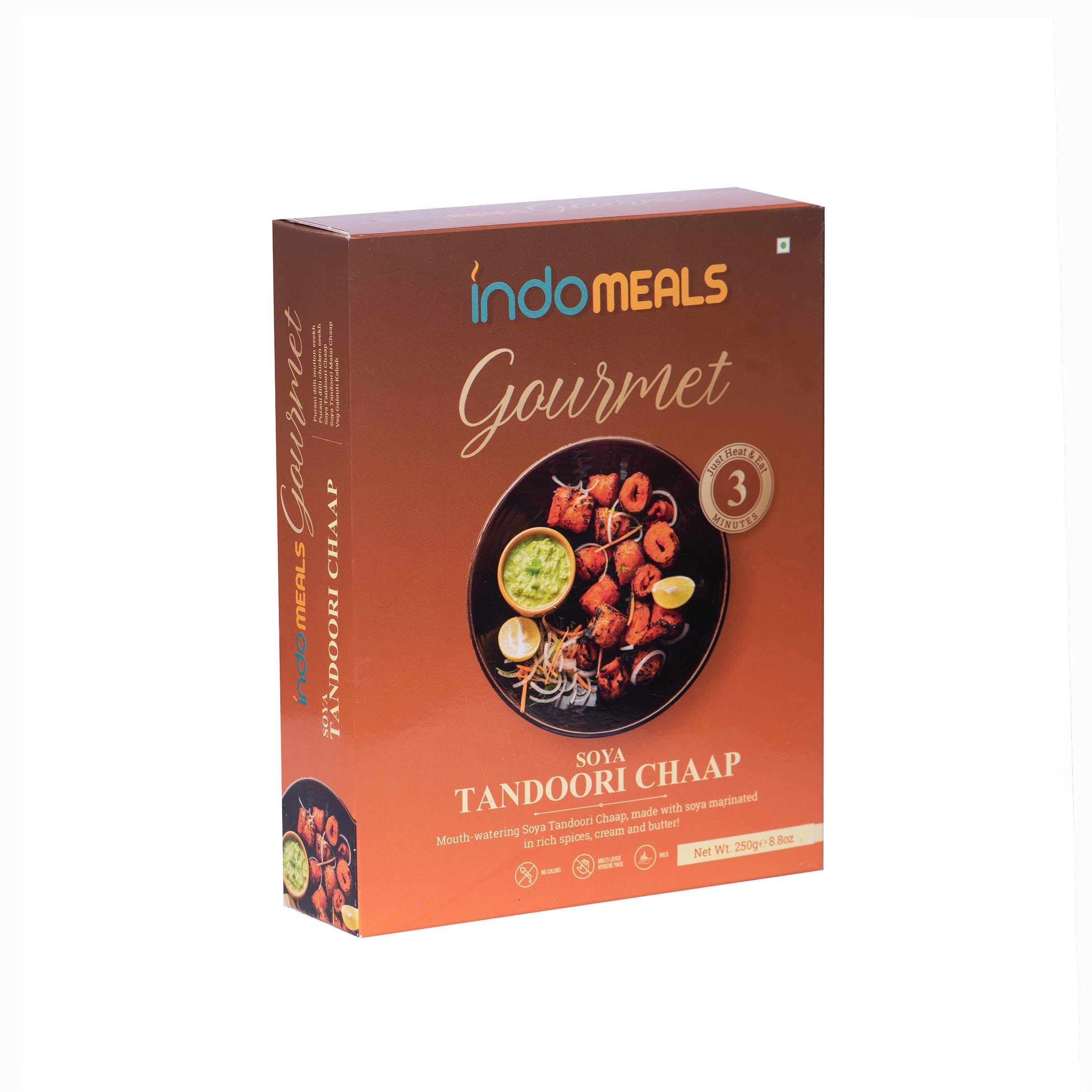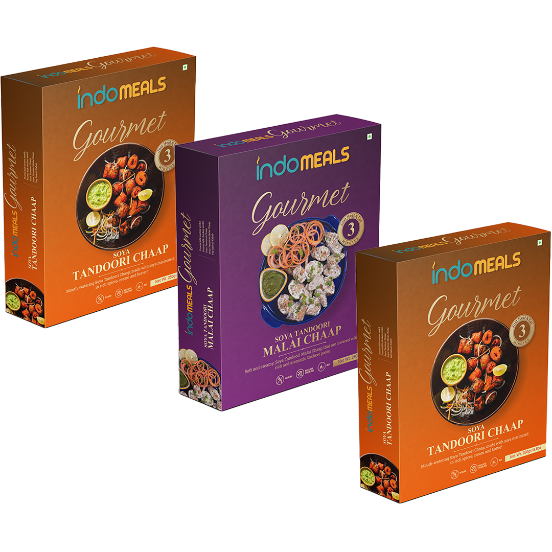 Ready to eat 2 packs of Soya Tandoori Chaap + 1pc Soya Malai Chaap of 250gm each.Instant solution for all your food cravings, Just Heat and EatShelf life: 18 Months; No Preservatives, No Artificial Flavors & No Colors Added; Safe and Hygienic PackagingWe use authentic and hand-ground spices to keep the homely essence intact in our instant mealsA variety of mouth-watering dishes are available