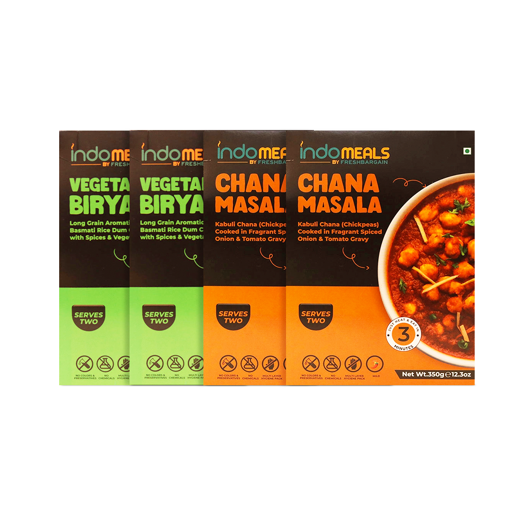Chef cooked Ready to eat 2 Chana Masala and 2 Veg Biryani.Instant solution for all your food cravings, Just Heat and EatShelf life: 18 Months; No Preservatives, Artificial Flavors, or Colors Added; Safe and Hygienic PackagingWe use authentic and hand-ground spices to keep the homely essence intact in our instant mealsA variety of mouth-watering dishes is available