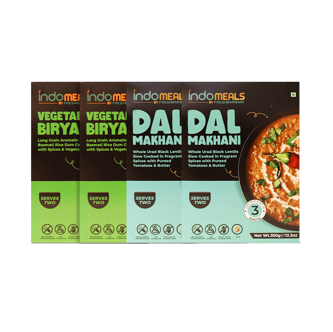 Chef cooked Ready to eat 2 Dal Makhani and 2 Veg Biryani.Instant solution for all your food cravings, Just Heat and EatShelf life: 18 Months; No Preservatives, Artificial Flavors, or Colors Added; Safe and Hygienic PackagingWe use authentic and hand-ground spices to keep the homely essence intact in our instant mealsA variety of mouth-watering dishes is available