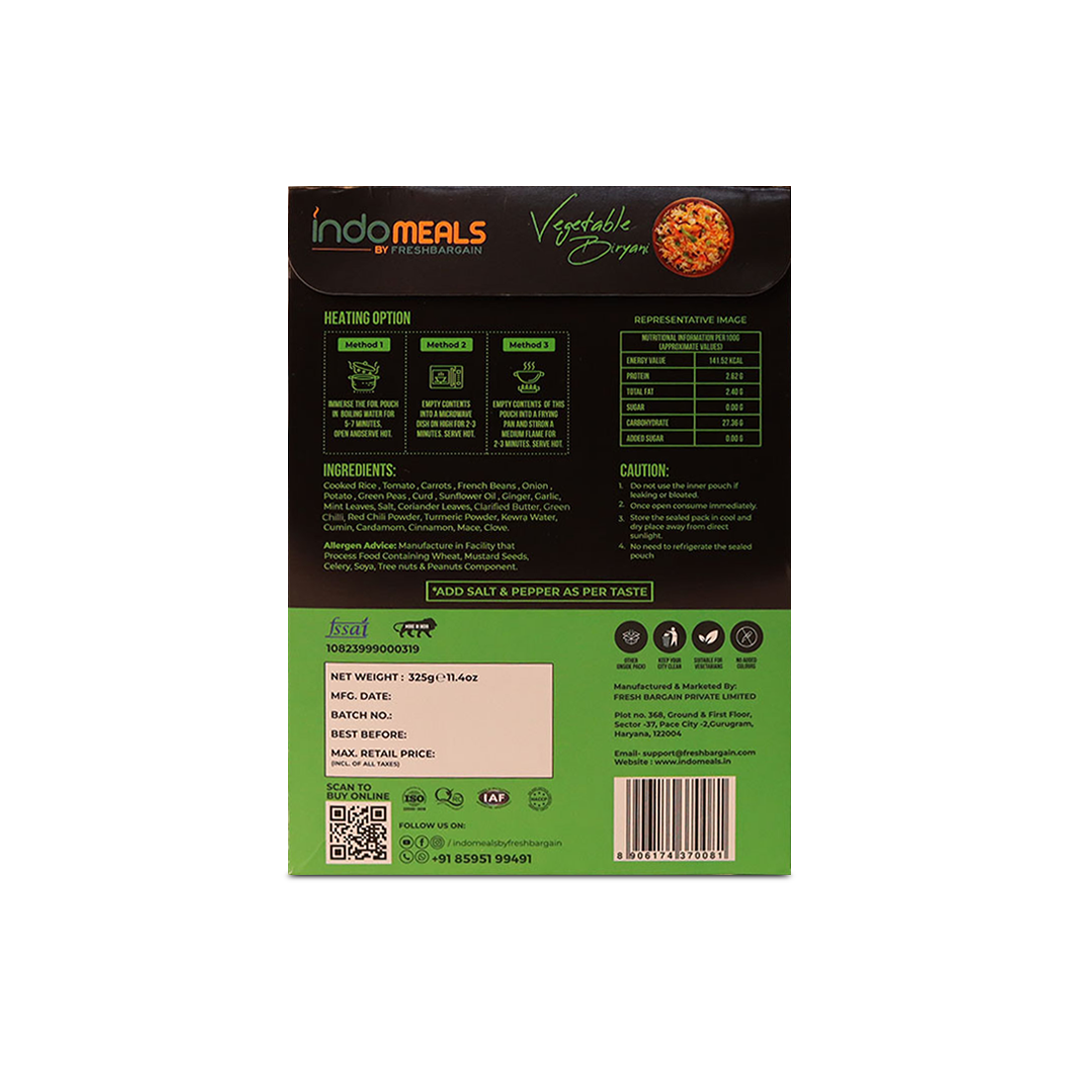 Chef cooked Ready to eat 2 Dal Tadka and 2 Veg Biryani.Instant solution for all your food cravings, Just Heat and EatShelf life: 18 Months; No Preservatives, Artificial Flavors, or Colors Added; Safe and Hygienic PackagingWe use authentic and hand-ground spices to keep the homely essence intact in our instant mealsA variety of mouth-watering dishes is available
