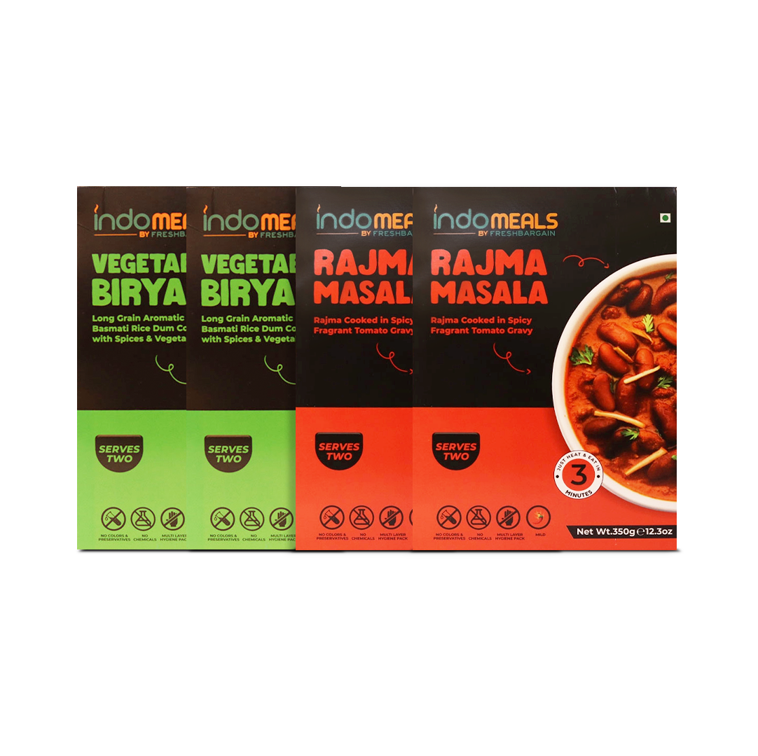 Chef cooked Ready to eat 2 Rajma Masala and 2 Veg Biryani.Instant solution for all your food cravings, Just Heat and EatShelf life: 18 Months; No Preservatives, Artificial Flavors, or Colors Added; Safe and Hygienic PackagingWe use authentic and hand-ground spices to keep the homely essence intact in our instant mealsA variety of mouth-watering dishes is available