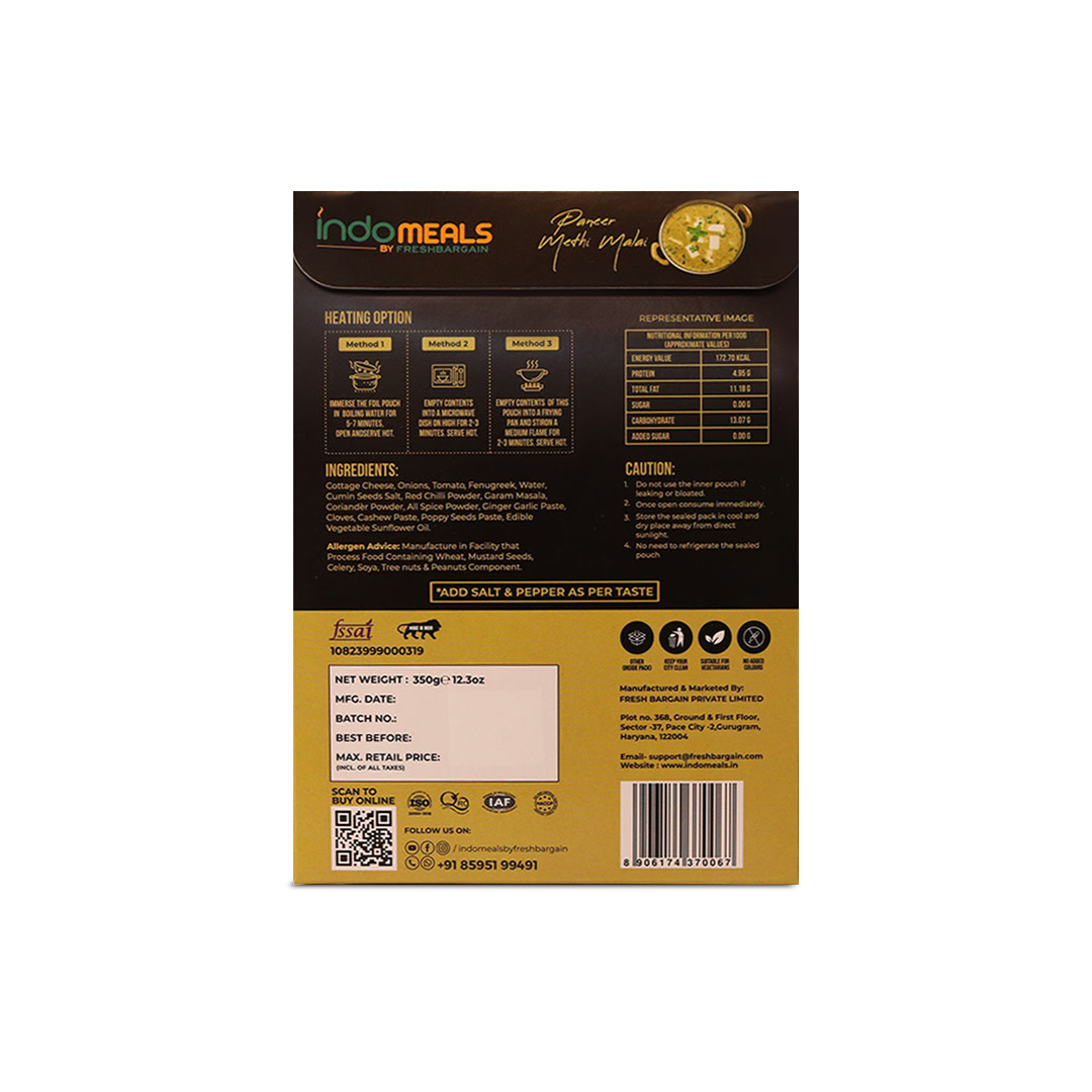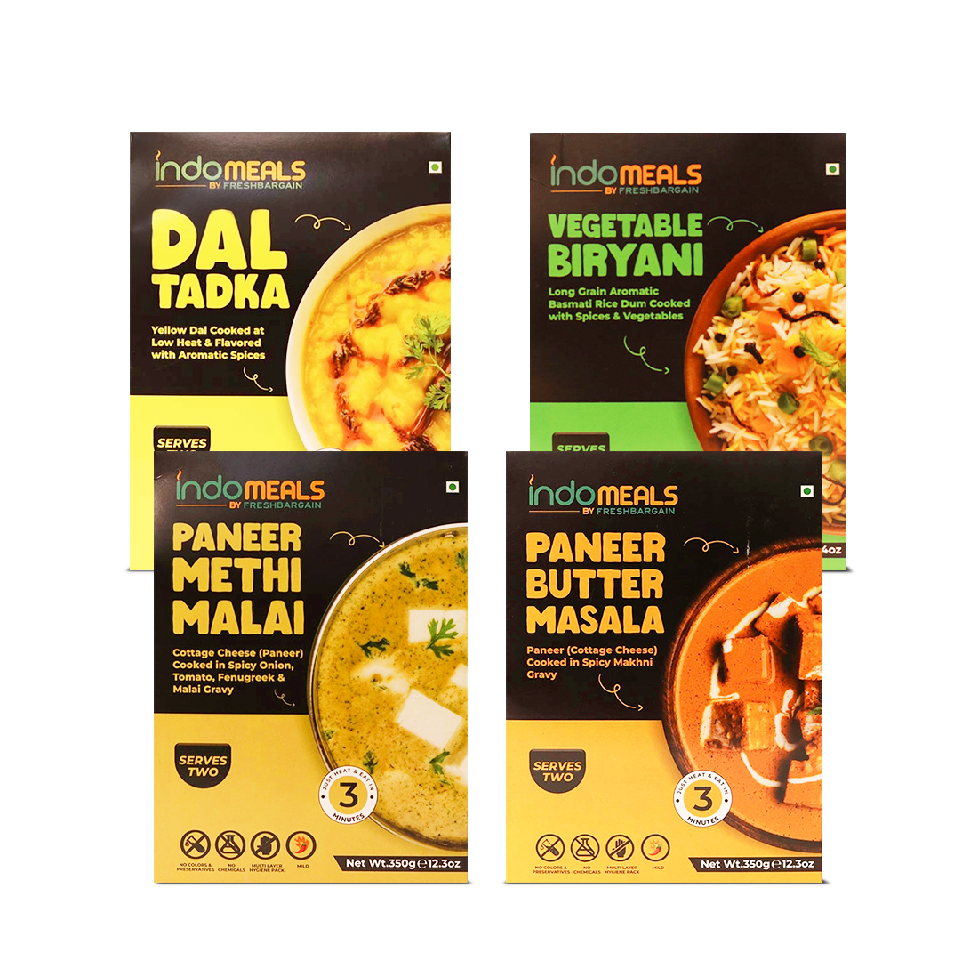 Chef cooked Ready to eat Vegetable Biryani, Dal Tadka, Paneer Butter Masala, Paneer Methi Malai, pack of 1 of 350gm eachInstant solution for all your food cravings, Just Heat and EatShelf life: 18 Months; No Preservatives, Artificial Flavors, or Colors Added; Safe and Hygienic PackagingWe use authentic and hand-ground spices to keep the homely essence intact in our instant mealsA variety of mouth-watering dishes is available